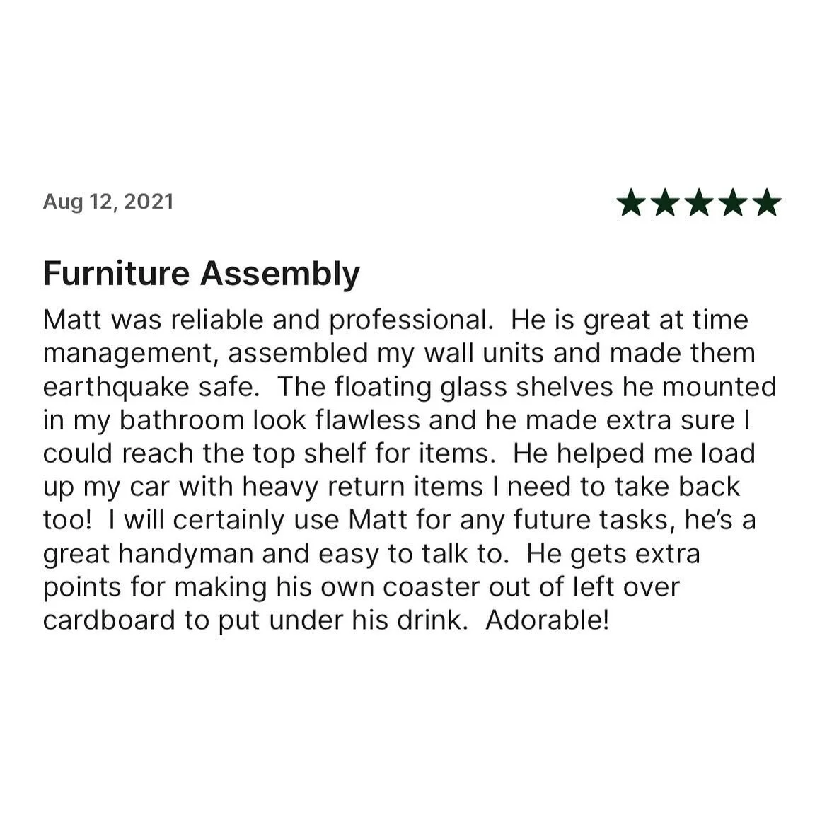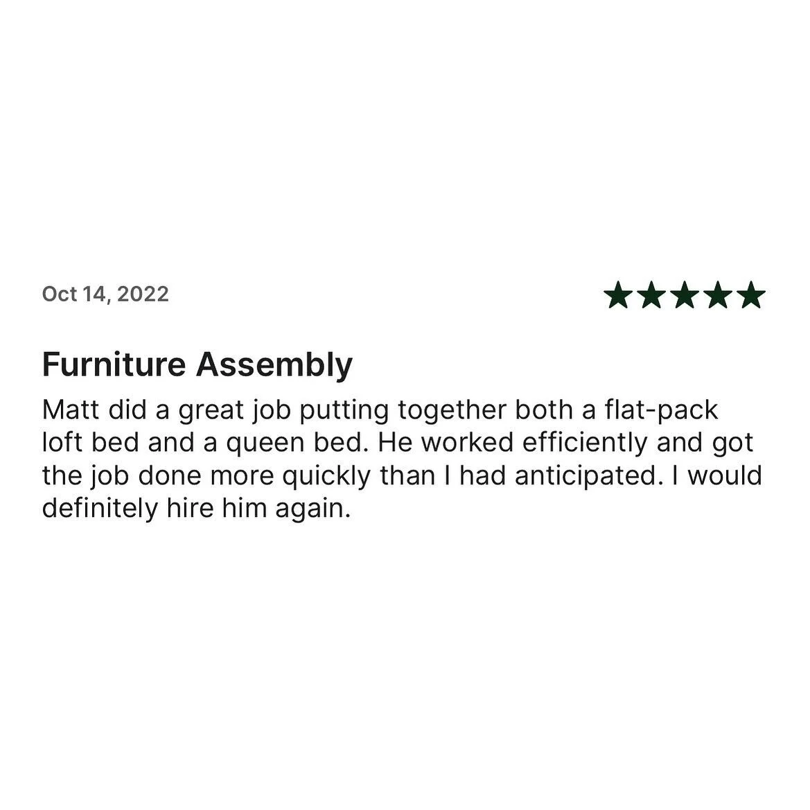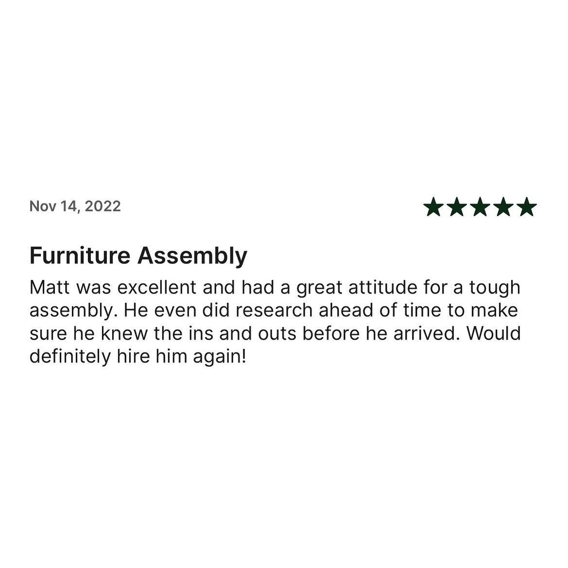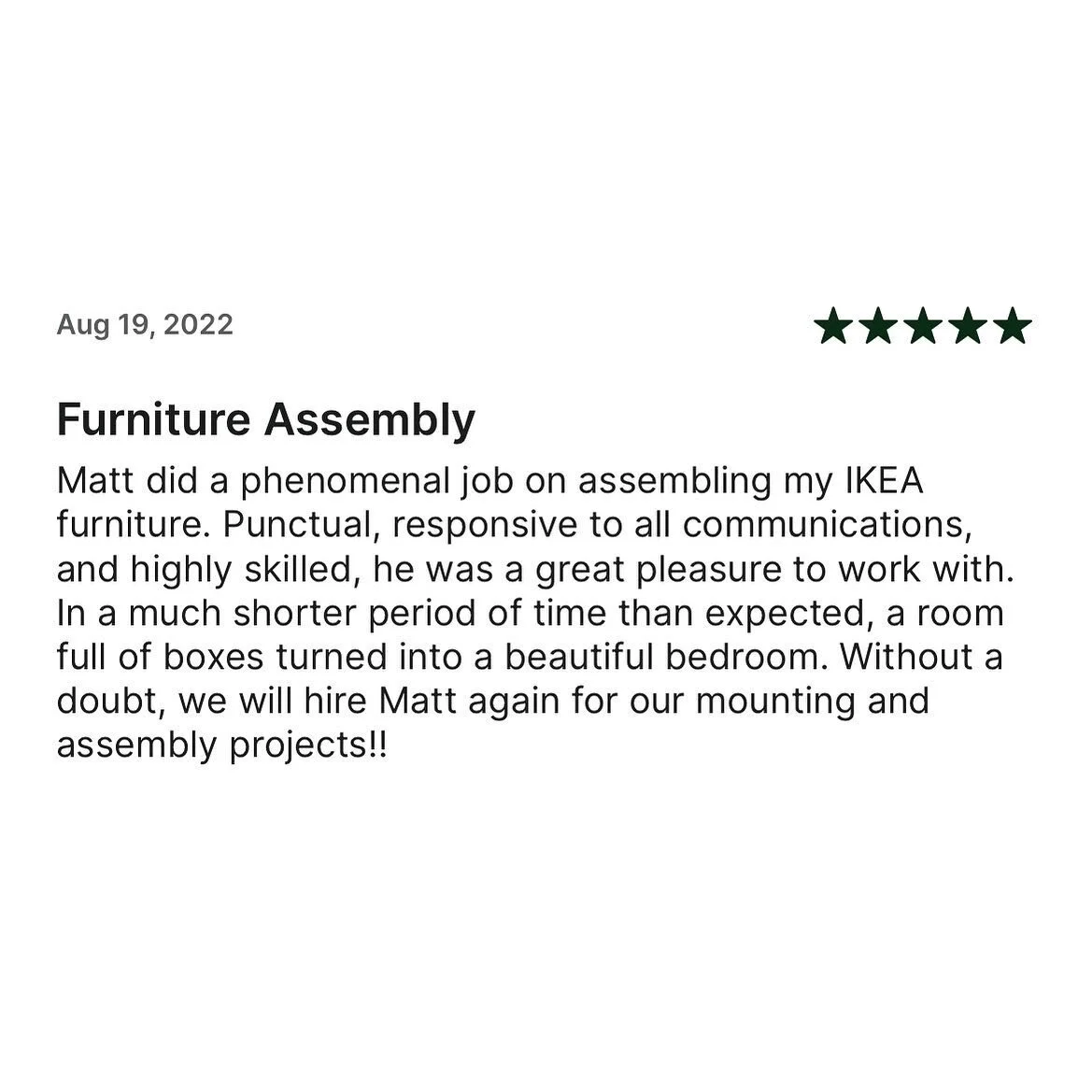 Matt is excellent at his craft. He’s professional, courteous and works hard to complete things in a timely manner. He installed (10) Ikea PAX units for our master closet and did a great job. I highly recommend him for your next furniture assembly and install.